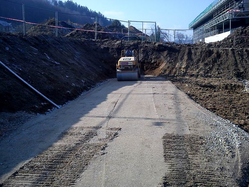 Bylo učiněno několik pokusů nepříznivé parametry zemin v základové spáře překonat sanační vrstvou hutněného štěrku, ale statickými zatěžovacími zkouškami bylo prokázáno, že splnění parametrů umožňujících založení bazénu dle původní PD v daných geologických podmínkách nelze očekávat. Z výše uvedených důvodů bylo nakonec nutno přistoupit ke změně způsobu založení bazénu (2014-2015).